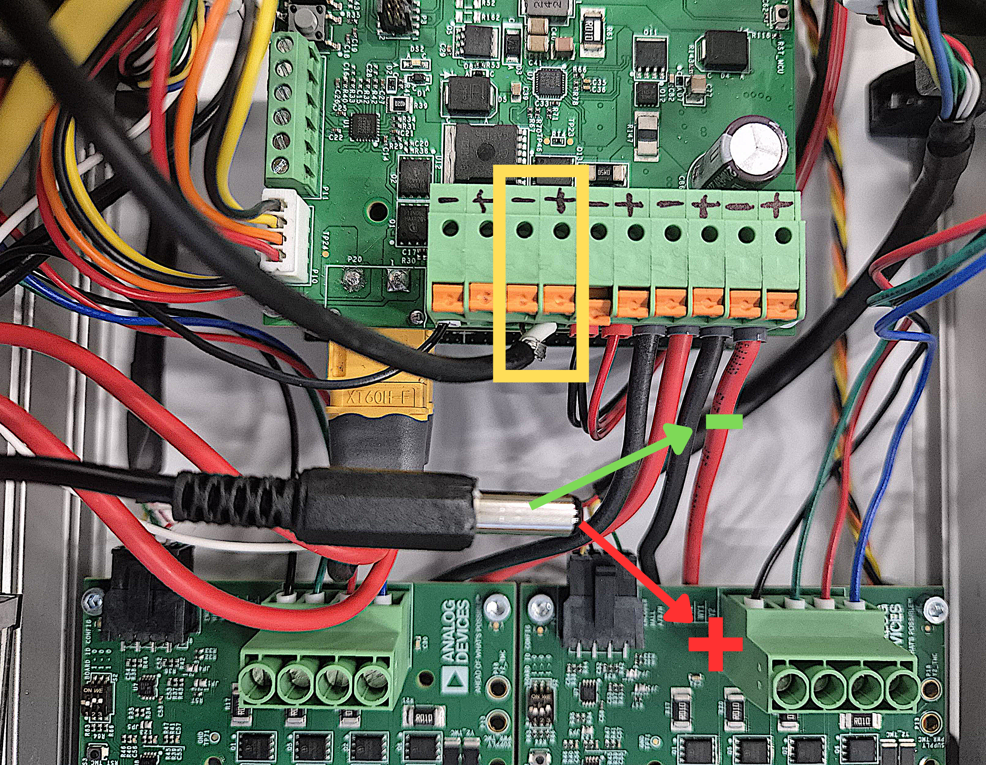 Connect a DC power jack with a 5.5 mm outer diameter and 2.5 mm inner diameter (male connector) to the ADRD5161 BMS. Ensure that the center pin is wired with positive polarity: