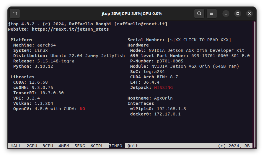 Reboot the device to activate changes. Run jtop in a terminal. It should look like: