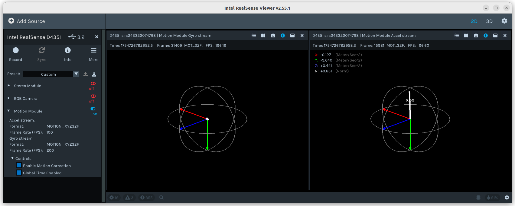 Select the 2D view mode and enable the Motion Module. Rotate the camera module and check how gyroscope and accelerometer values change.