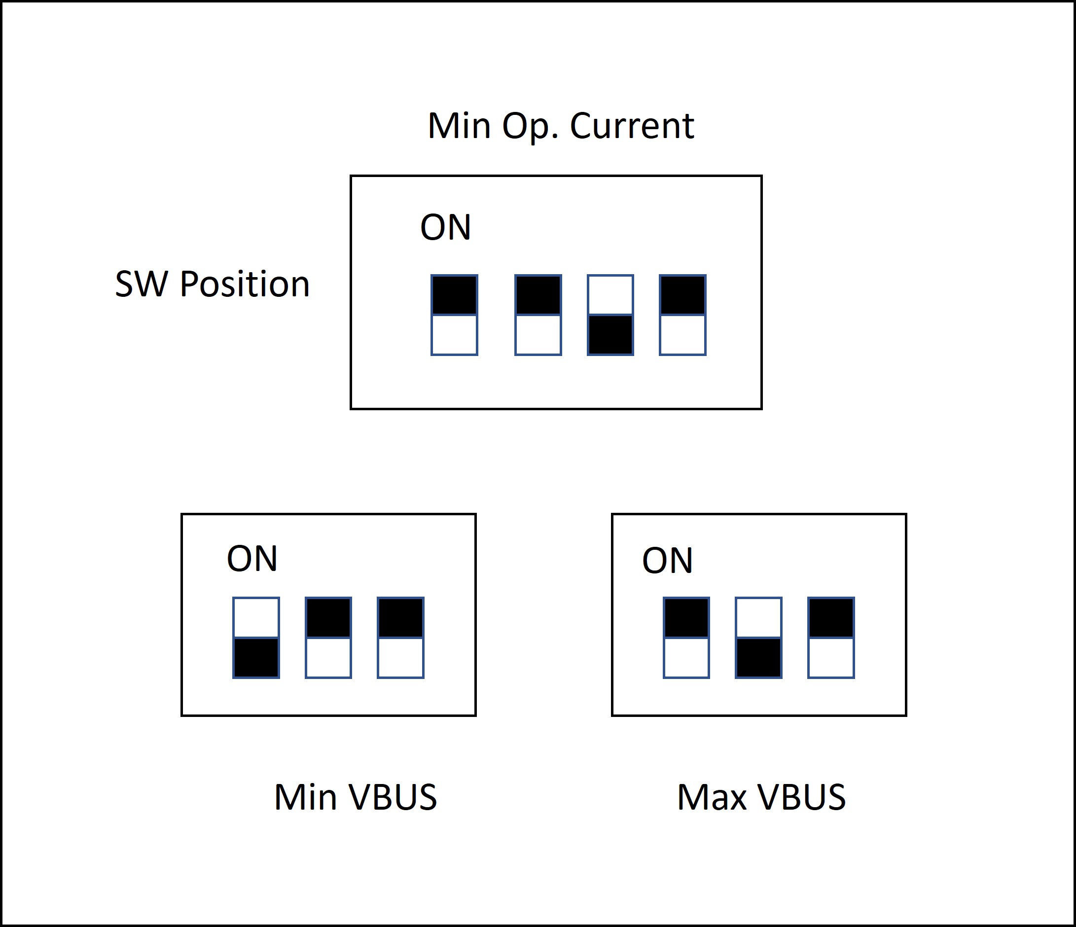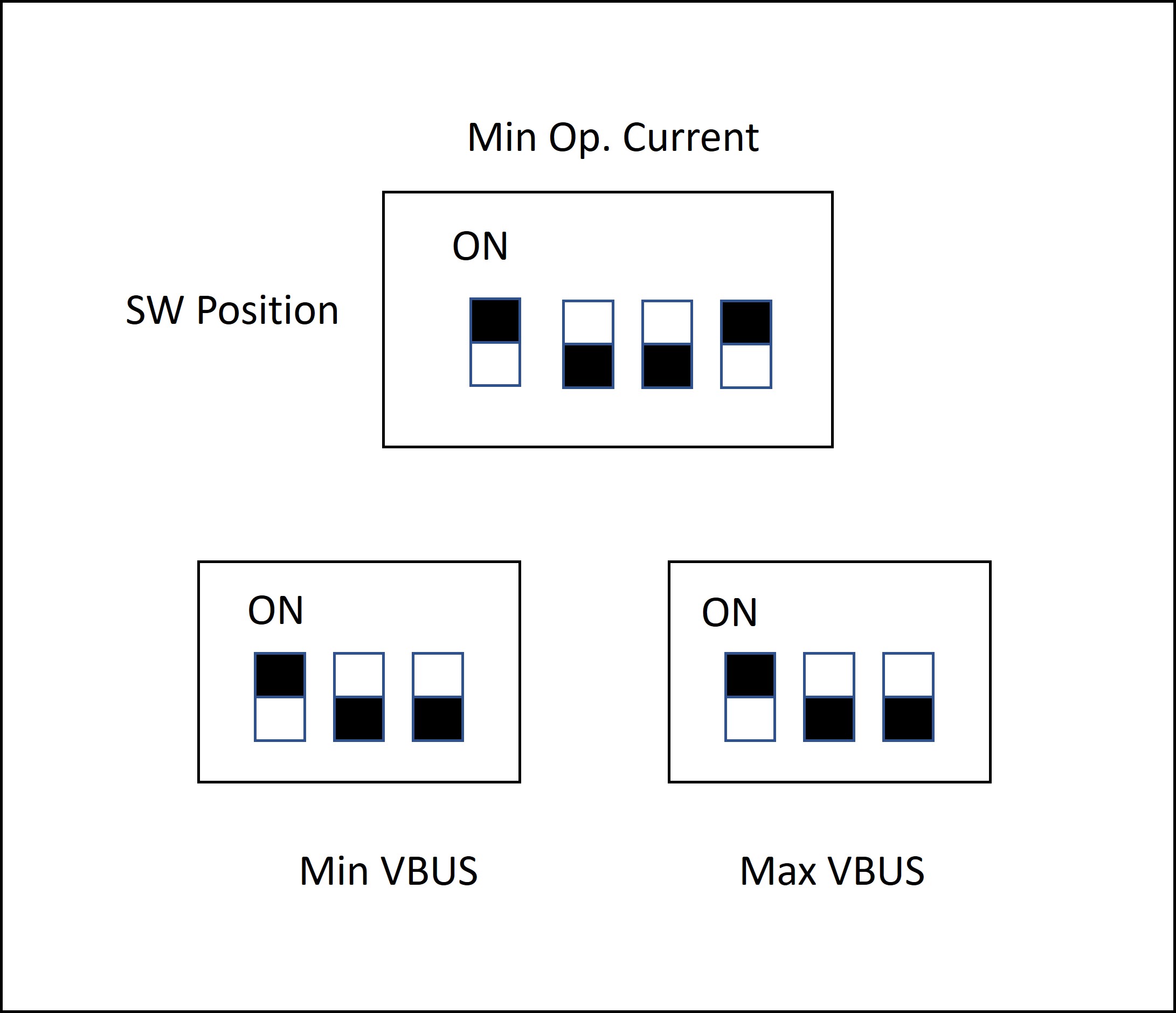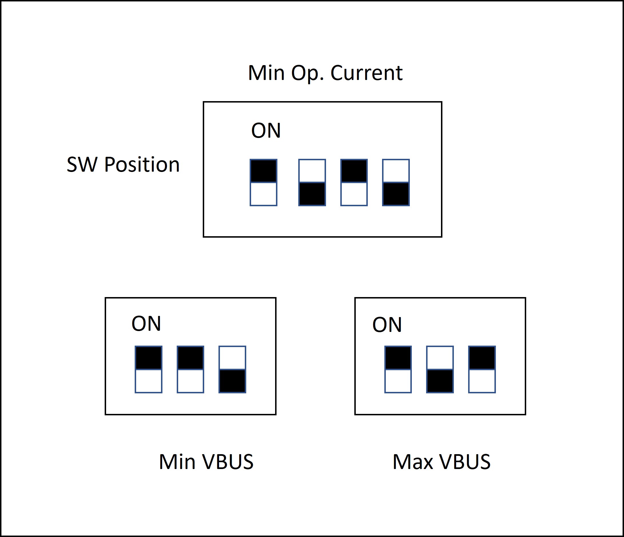 Here are two tables with all the combinations possible, one for the Operating Current DIP switch and one for Min/Max VBUS Voltage DIP switches: